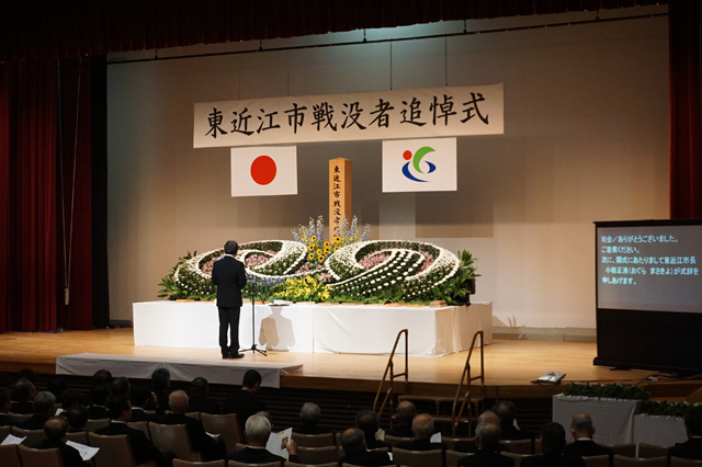 【東近江】 終戦から79回目の夏を迎え、今年も東近江市戦没者追悼式が20日、愛東コミュニティーセンターで営まれた。遺族をはじめ、小椋正清市長、国会議員、県市議会議員、行政関係者などの約250人が参加し、鎮魂と平和の祈りを捧げた。