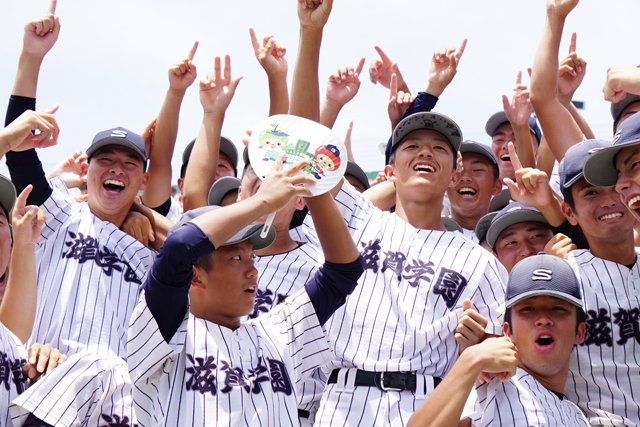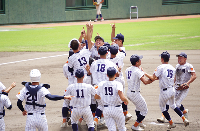 【東近江】高校野球選手権滋賀大会の決勝(滋賀学園×綾羽)が27日、マイネットスタジアム皇子山で開かれ、熱戦を勝ち抜いた滋賀学園が53校の頂点に輝いた。同校の夏の大会優勝は15年ぶり2回目となる。決勝では滋賀学園の先発、脇本耀士選手(3年)がマウンドで躍動した。140キロ前後の直球を中心に変化球を織り交ぜ、勢いある綾羽打線を7奪三振の被安打2で完封。自慢の守備陣も勝負どころでその堅守を発揮し、攻撃陣も相手の失策を誘うなどして得点を重ね5―0と勝利をつかんだ。優勝が決まった瞬間、マウンドに駆け寄った選手、スタンドで見守った選手ともに人差し指を空に掲げた。涙を見せた主将の門田侑也選手は「甲子園でも全力で目の前の一線を勝ち抜き、上を目指していきたい」と先を見据えた。甲子園球場で開かれる全国高校野球選手権大会は8月7日に開幕。組み合わせ抽選会は4日に行われる。