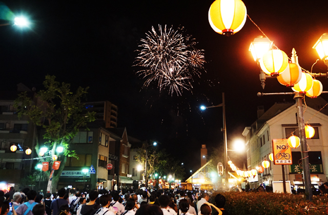 このあと、観光花火が延命山から打ち上げられ、赤や緑、青などの大輪の花が夏の夜空を焦がした。駅前の歩行者天国に詰めかけた市民は、夏の夜を彩る競演に歓声を上げていた。