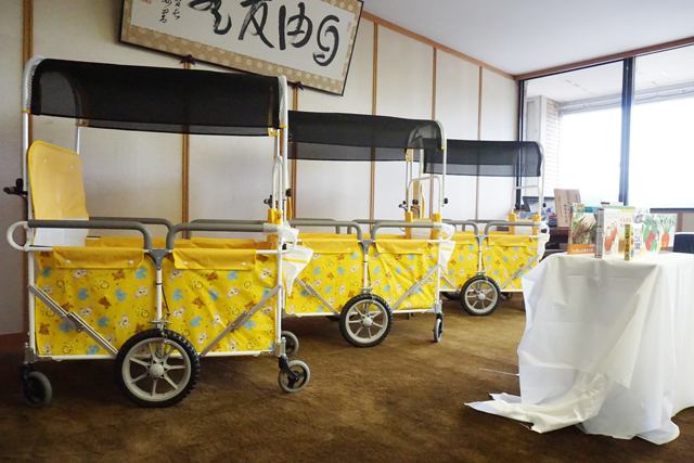 交通安全教育備品の避難車兼用おさんぽカーは、保育現場の要望に合わせた寄贈で、町内の低年齢児が通う保育園とこども園で使われる見込み。