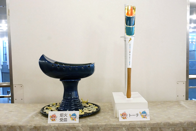 「炬火受皿」は、県工業技術総合センター信楽窯業技術試験場が「びわこ国体」のデザインを継承しつつ、より琵琶湖をイメージさせるよう深みのある青色でデザイン。信楽陶器工業組合が制作した。さらに、受皿を彩るピースは各市町の小学校などで子どもたちが作った作品が用いられている。