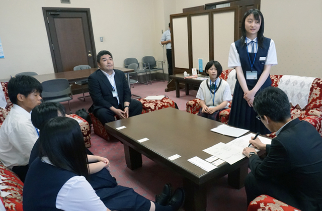 県庁を訪ねた5人は、まず県議会議長室で有村議長と面会し、石垣雅敏根室市長からのメッセージを代読、続いて祖母が色丹島出身の北方領土島民3世の田野平さんが同弁論大会で入賞した「祖母を故郷に連れて行きたい。そのためにも北方領土問題について国民全員に関心を持ってもらいたい」といった内容の作文を披露した。