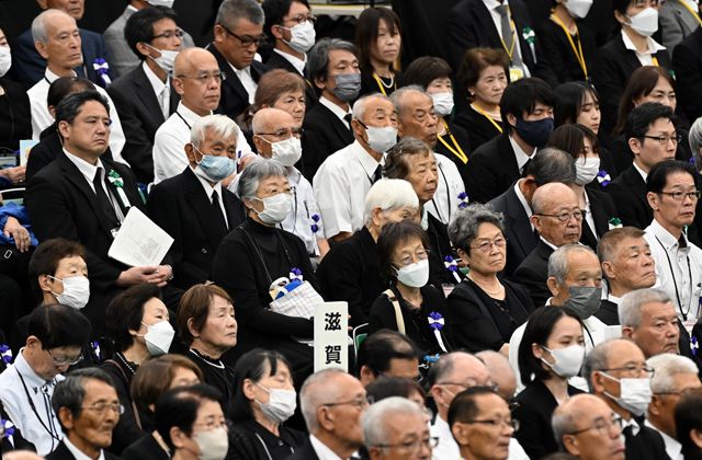 滋賀県からは59人、全国からは約3600人の遺族(うち付き添い約400人)が参列。そのほか約700人の関係団体代表、閣僚らが参列し、岸田文雄首相は「戦争の惨禍(さんか)を二度と繰り返さない。戦後79年が経つが、歳月がいかに流れても、この決然たる誓いを世代を超えて継承し、貫いていく」と式辞を述べた。