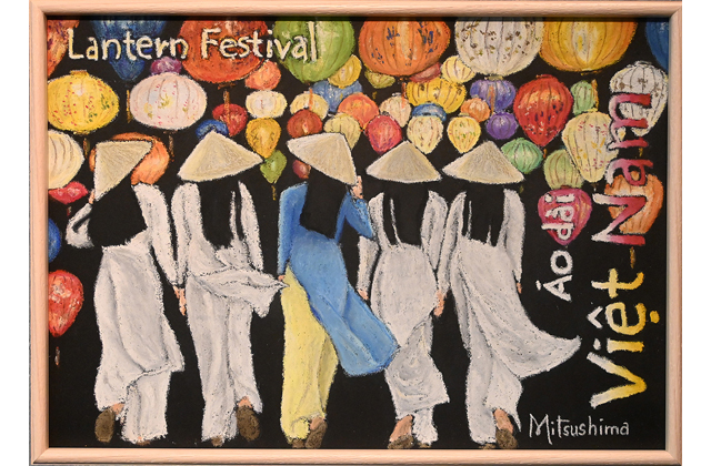 ブラックボードに色鮮やかなオイルパステルで描かれた独特のグラデーションが美しいのが特徴。展示作品は国や地域のイメージを描いた力作が並んでいる。
