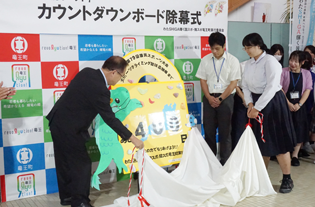 【竜王】 竜王町は先月29日、同町が会場となっている「わたSHIGA輝く国スポ・障スポ」スポーツクライミング競技(2025年10月3日~5日)の開催400日前を迎えることを記念し、カウントダウンボードの除幕式を行った。