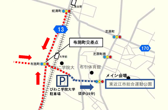 車両で来場する場合は、県道13号彦根八日市甲西線の布施町交差点から来場する。びわこ学院大学駐車場に臨時駐車場を設ける。電車を利用する場合、近江鉄道大学前から徒歩15分。