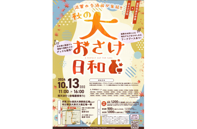 また、滋賀酒造組合では10月13日午前11時~午後4時、大津市浜大津の京阪びわこ浜大津駅前広場「スカイクロス」一帯で滋賀の地酒と地域の味覚を楽しめるイベント「秋の大おさけ日和」を催す。同イベント参加料金は前売り券1200円、当日券1500円。参加チケットには会場入場証となる缶バッジと会場で使える料理のチケット100円10枚セットがつく。前売り券はPass Market(パスマーケット・文末二次元コード内参照)で販売中。