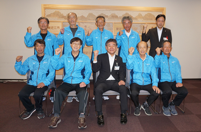 壮行会では、小椋正清市長がはじめのあいさつで「東近江の高齢者ががんばっている姿を全国に示してほしい。活躍を祈念します」と激励の言葉をかけた。