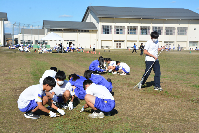 【東近江】学校のグラウンドに伸びた草の刈り取りを全校生徒で行い、刈り取った草の重量を各クラスで競い合う「草取り大会」がこのほど、五個荘中学校で行われた。