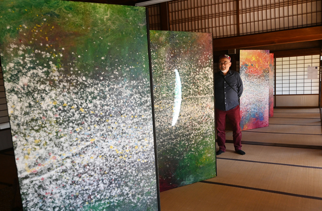 このうち、戦争が続くウクライナから3年続けて来日したルイーザさん(25)は、安土の自然風景の油絵を、また、ドイツのトーマスさん(56)は、代々受け継がれる安土の民家を訪問し、家に対する日本の伝統文化を映像にした作品、サーカスのパフォーマーでもあるスペインのニコさん(53)は、漢字と指の動きや組み手の形を表現し、掛け軸や障子に描いた絵など、ユニークな作品が並んでいる。