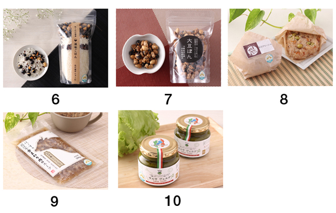 (1)権座の米粉パン(壱製パン所)(2)スイカの生チョコ(アンデケン)(3)近江牛包みハンバーグ(カネ吉ヤマモトフーズ)(4)「安土の秘蜜(尾賀亀)(5)むべ茶(前出産業)、(6)炊くだけ簡単!滋味ごはん(近江園田ふぁーむ)(7)大豆ぽん(同)(8)えびアヒージョ炊き込みご飯(おきしま倶楽部)(9)「ほっとする近江牛骨まわり肉のスープ(びわこフード)(10)「イタリアン万能ソース サルサ・ヴェルデ(ヴィーテ・イタリア)」。