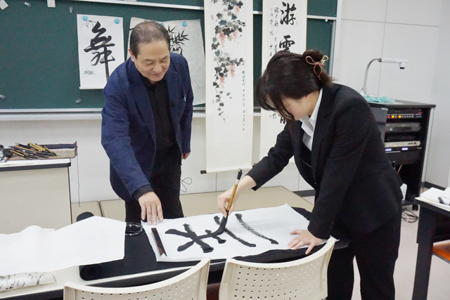 講義では、中国書道と水墨画の筆の持ち方、筆の使い方を丁寧に解説しながら劉氏が何度も実演し、講義の最後には体験を希望した生徒が中国書道に挑戦したものを添削していた。