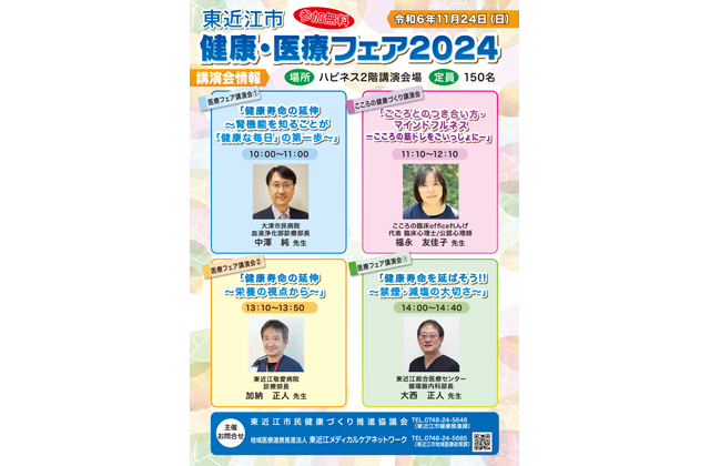 【東近江】 東近江健康・医療フェアが24日午前10時から午後3時まで、保健子育て複合施設ハピネス(東中野町)で開催される。市民健康づくり推進協議会と東近江メディカルケアネットワークの主催。参加無料。