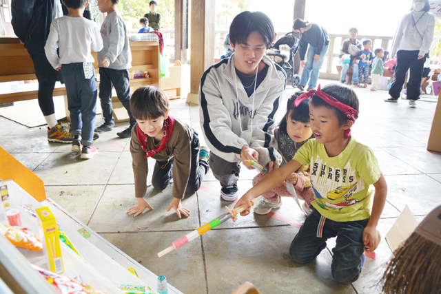 また、17日には、展示会に合わせて、にじや教室に通う子どもたち主催の体験ブース「こどもマーケット体験」が太郎坊宮の絵馬殿で開かれた。まつぼっくりのツリー制作や、景品が当たる射的コーナーなど子どもたち自作の体験ブースが並び、参拝に訪れた親子らと交流を深めていた。