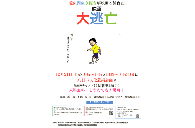 愛東・湖東・永源寺地区が舞台となる「大逃亡」は、家族サービスもままならない主人公の中年サラリーマン男性がトラブルに巻き込まれ、なぜか住民たちから追われる大逃亡劇を描いた作品となっている。