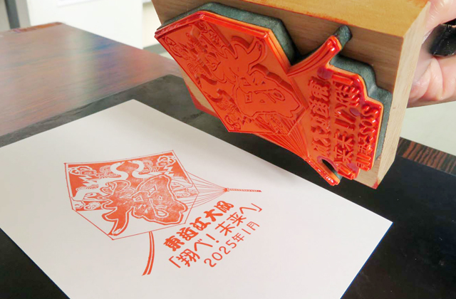 来年の成人式で揚げられる祝新成人20畳敷大凧をモデルにしたスタンプで、大きさは縦8センチメートル、横6・5センチメートル。館内には2畳敷サイズの大凧も展示され、新年を記念したオリジナルフレームとともに撮影も楽しめる。押印期間は26日まで。