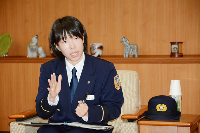 村田鈴氏(東近江行政組合愛知消防署・消防士長)東近江市生まれ。2009年に消防吏員となり、能登川消防署、日野消防署で消防隊、救急隊として従事。現在は愛知消防署で予防係(消防設備担当)として勤務。35歳。