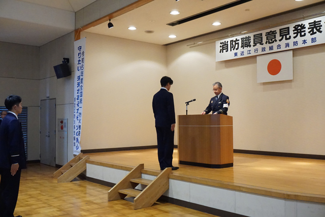 【東近江】 東近江行政組合消防本部の消防職員意見発表会が24日開催され、本部や管内の八日市、近江八幡、日野、能登川、愛知の各消防署からの若手職員11人が出場し、日頃の業務経験に基づいた提案や抱負を発表した。