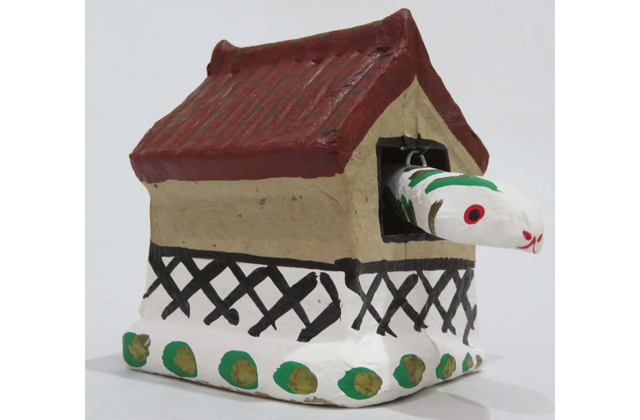 館内には、全国各地の蛇をモチーフにした個性豊かな凧をはじめ、扇やひょうたんなど新春を祝う約40点を展示。凧のほかにも、東近江市の小幡(おばた)人形など全国の土人形や張り子といった郷土玩具約50点が展示され、お正月気分が楽しめる。