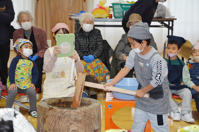 この日は園で開かれていた餅つき大会にも手返し役で参加。利用者らは杵(きね)を持って豪快に餅をつく園児らを笑顔で見守り、交流を深めていた。