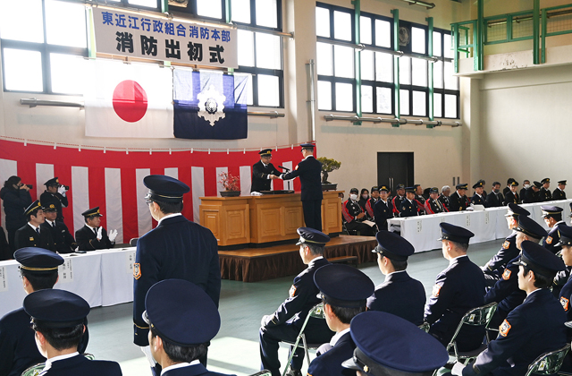 【東近江】東近江行政組合消防本部の出初式が7日、近江八幡消防署で行われ、令和7年の消防活動の誓いを新たにした。
