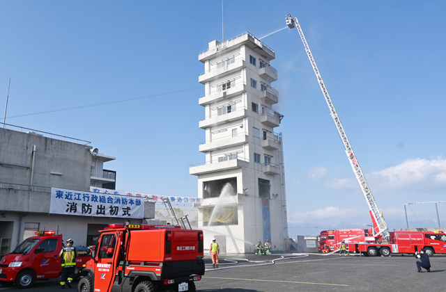 屋外訓練場で行われた第2部の消防演技では、近隣住民や保育園児、消防職員の家族らが見守るなか、消防音楽隊の演奏に続いて、昨年導入された高機能ドローンや小型救助車など車両10台が出動し、大規模地震を想定した負傷者救出と火災防御訓練が繰り広げられた。最後に「安心を 未来に繋ぐ 東近江消防」の横断幕を掲げてことし一年の守りを誓った。