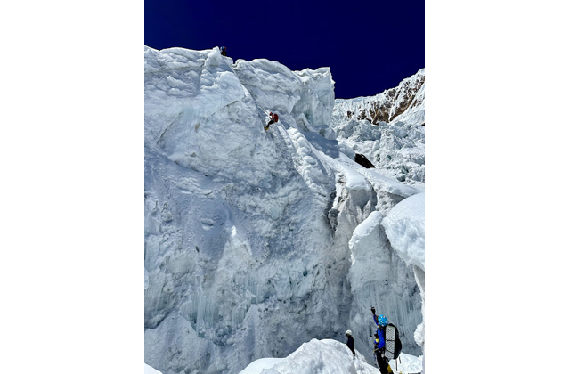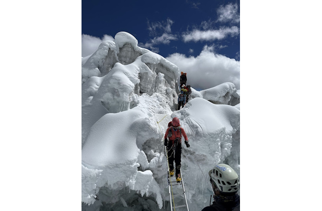 氷河地帯を進む際のクレバス(氷の割れ目)を飛び越えたり、大きなクレバスに架けられたハシゴを渡ったりと、本や映画で見た世界が次々と目の前に現れることに多少の恐怖を感じながらも興奮した。高い氷壁や雪壁を登り下りする場面は、そのスケールの大きさに驚いたが、出国前に東近江市にある岩場のドラゴン道場で繰り返し練習を積んだ時と同じ道具を使い、同じ動作をするだけだったので落ち着いてできた。