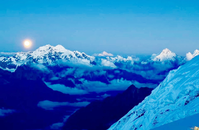 山の天候は変わりやすく、昼間は雪が降り、視界が悪い中を行動していた日でも夜には満天の星空や綺麗な月明りの日もあった。晴天無風の日中は陽射しが強くて、標高6000m付近でも日本の夏山登山と変わらない服装に高所靴とアイゼンを履いて歩いていた。この標高まできて暑さで疲弊するとは思ってもいなかった。