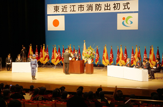 【東近江】 東近江市消防出初式が13日、八日市文芸会館で行われ、27分団の消防団員約340人が参加し、今年一年の防災の誓いを新たにした。