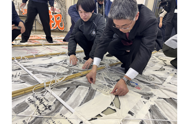 市民から集まった約300枚の願い札には、市の発展を願う思いや、子どもたちの健やかな成長、自身の目標などが書かれ、職員らは凧と骨組みをつなぎ合わせるよう丁寧に張った。