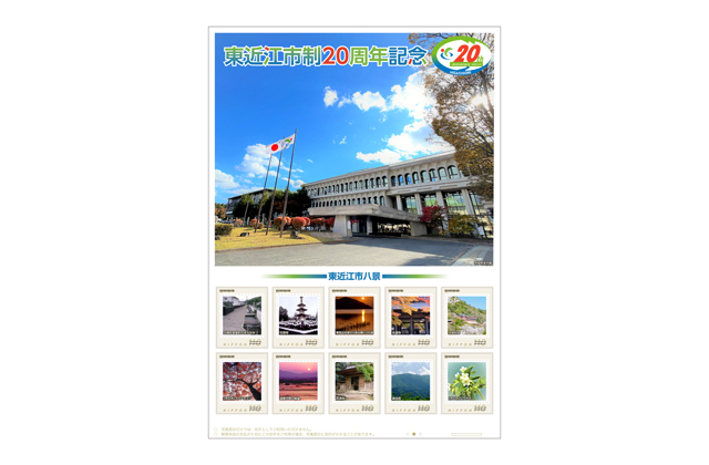 同市が市制20周年を前に市内郵便局に記念切手の製作を相談し、実現した。記念切手には、永源寺や太郎坊宮、五個荘金堂のまちなみなどを選定した「東近江八景」、市の花「ムラサキ」、市の木「イロハモミジ」があしらわれている。