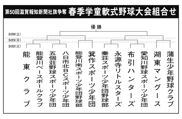 【東近江】 滋賀報知新聞社旗争奪春季学童軟式野球大会(滋賀報知新聞社、東近江市軟式野球連盟主催)がきょう22日、東近江市ひばり公園湖東スタジアム(池庄町)で開幕する。