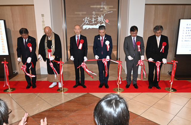 16日午前9時からオープニングセレモニーが行われ、主催者を代表して三日月大造知事が「戦国の世を終わらせようと信長がめざした天下統一の知恵がここ安土の地にあるのではないか。そうした(歴史上の)平和を学ぶ拠点としても博物館を活用していきたい。また、現在進めている発掘調査の成果もここで紹介していきたい。築城450年が近づいており、その盛り上げにも取り組んでいきたい」とあいさつした。