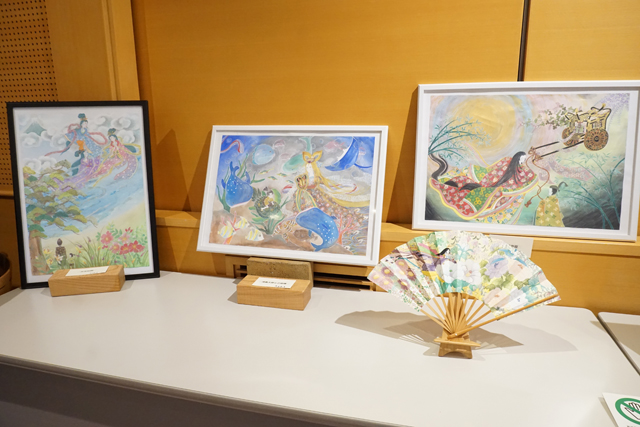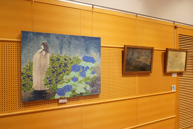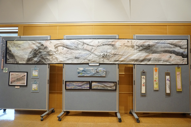 会場には姉の礼子さんによる水彩画、妹の紀久子さんによる墨彩画、紀久子さんの娘小百合さんによる日本画を多数展示。