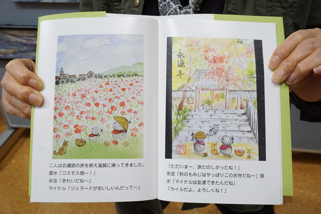 また、会場では紀久子さんによる紀行絵本「お地蔵さんどこ行くの?」の見本誌と原画も展示中。紀久子さんはこれまで同本の売上金をユニセフなど慈善団体へ寄付しており、今後も売上金は寄付したいとの意欲を持っている。同絵本ではお地蔵さんがたずねる場所として道の駅あいとうマーガレットステーション(東近江市妹町)や永源寺(同市永源寺高野町)も登場。webサイト(https://kikoproject.thebase.in)または次のQRコードより購入できる。さらに、展示最終日の4月6日午後3時~午後4時、会場で絵本原画の複製ポストカード(道の駅あいとうマーガレットステーションコスモス畑を描いたページのもの)を先着10人にプレゼントする。
