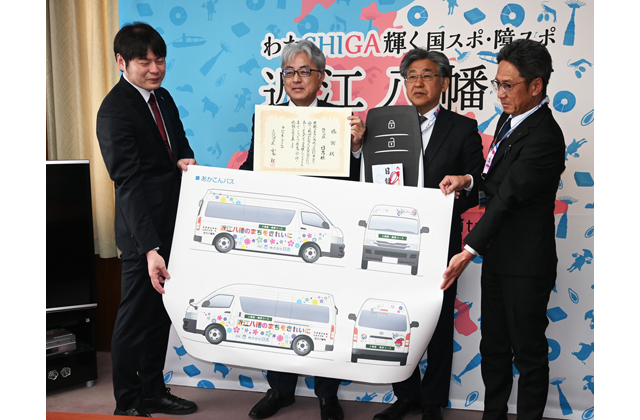 【近江八幡】環境に関する分析や保全、施設管理等を業とする株式会社日吉(本社・近江八幡市北之庄町)は先月27日、創業70周年を記念して近江八幡市に市民バス用の車両1台を寄贈した。