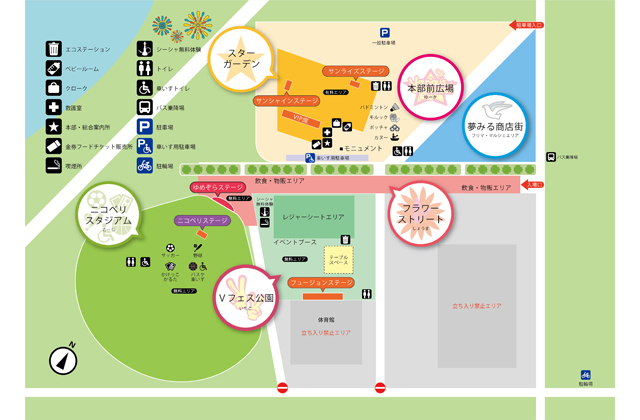 ・ニコベリステージ(野球場内)とゆめのそらステージ(野球場前)、フュージョンステージ(体育館前)は、午前10時~午後8時