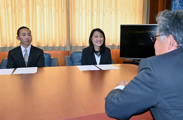 3日、市役所で行われた委嘱式で小西理市長は「船長の問題は、長年の課題だったので、(2人は)島民のみなさんから期待を集めていると思います。島は高齢化が進んでいますが日本の原風景みたいなところが残っている貴重な島です。島には活躍していただいている先輩隊員がいます。隊員仲間で集えるグループのコミュニティを作って、日々の活動に役立てていただくこともいいかなと思います。頑張ってください」と述べ、活躍に期待を寄せた。