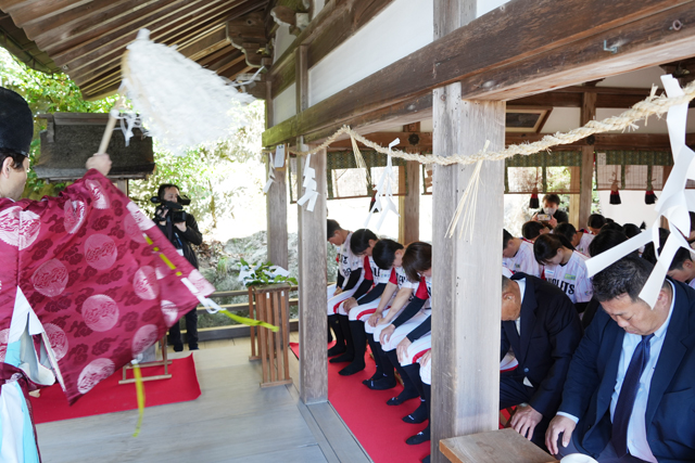 3月から関東地区の大会参加やオープン戦を重ねており、この日も、チームの出陣式と位置づける毎年恒例の太郎坊宮で必勝を祈願した後、ホームグラウンドのすこやかの杜で福井工業大学と試合を交え、実践を重ねた。