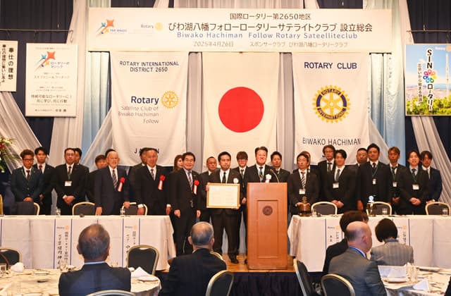 同クラブは、びわ湖八幡ロータリークラブをスポンサーに会員の事業後継者や地域の若手実業家を中心に26人のメンバーで発足した組織で、同クラブが所属する2650地区(滋賀、京都、奈良、福井の96クラブ)では初めての設立。