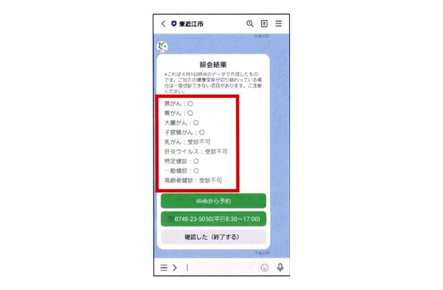 【東近江】 東近江市は、市民の健康診査などの受診率と利便性の向上を図るため、公式LINEを通じて受診対象となる健診(検診)を個別に検索できるサービスを1日から、予約の受け付けは16日から始める。