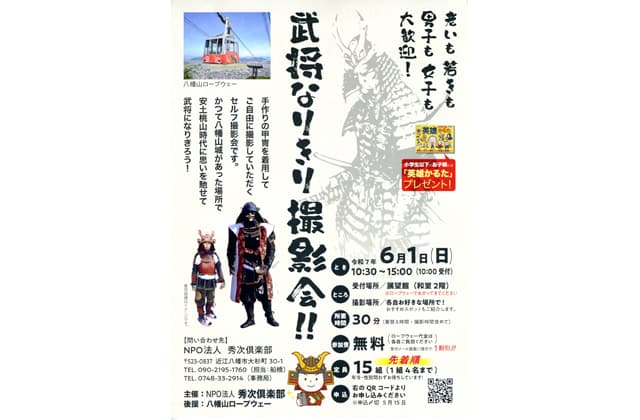 自らが手作り甲冑を着用して自由に撮影するセルフ撮影会で、かつて安土桃山時代に八幡山城があった歴史深い場所で甲冑を着用して戦国時代の武将気分を楽しんでもらおうという企画。