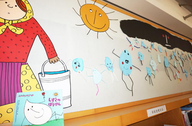 さらに児童コーナーでは、永源寺もみじ幼児園4歳児が、水の不思議を主人公「しずく」の視点から描いた絵本「しずくのぼうけん」を絵画にした作品も同時に展示している。