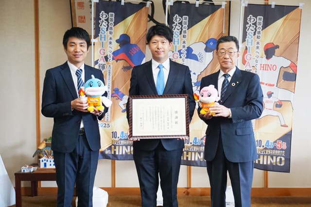 日野町では10月4日~5日、大谷公園野球場で国民スポーツ大会の軟式野球競技(5市1町で分散して試合を実施)を行う。今回寄せられた協賛金は、スポーツ教室や講演の実施など、子どもたちが夢を感じられるようなスポーツイベントの費用として活用される。