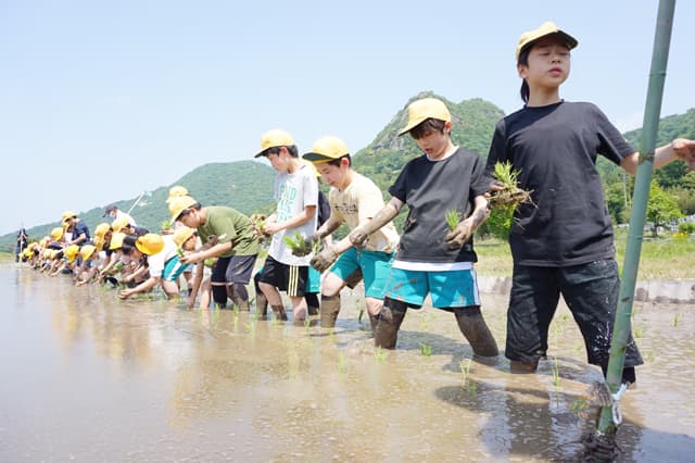 【東近江】 東近江市立箕作小学校(小脇町)の5年生(88人)が20日、学校近くの水田で田植えを体験した。同市の「田んぼの学校」の一環で、米づくりの体験を通して、農業への関心を高め、食べ物への大切さを学んでもらおうと、市内の全小学校22校で実施している。
