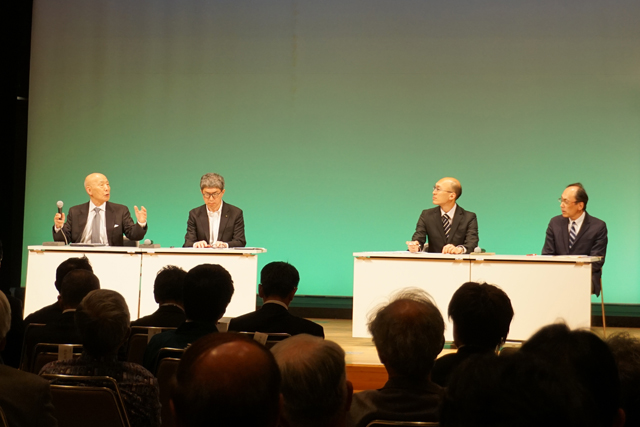 【日野】 日野町町民会館わたむきホール虹でこのほど、「第1回商人道サミット 日本の三大商人に学ぶ『商人道』の実践」(一般社団法人100年経営研究機構、日野町が共催)が開かれた。