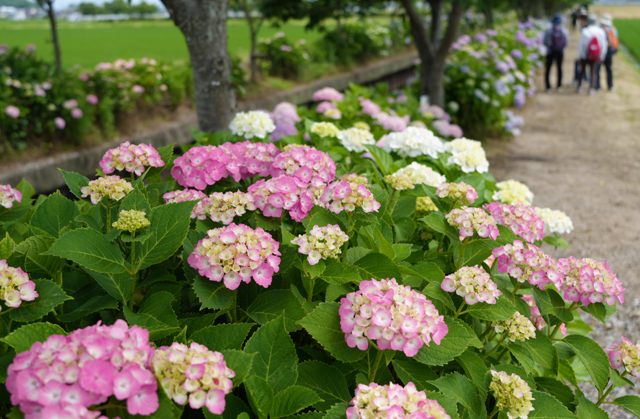 【東近江】東近江市宮荘町を流れる宮荘川のアジサイが今年も見ごろを迎えた。広がる農地の一角を彩るアジサイの列はまさに紅一点。梅雨の訪れとともに約700メートルの川の両沿い約2000株のアジサイが一斉に花を開き、色とりどりの花が来場者の目を楽しませている。