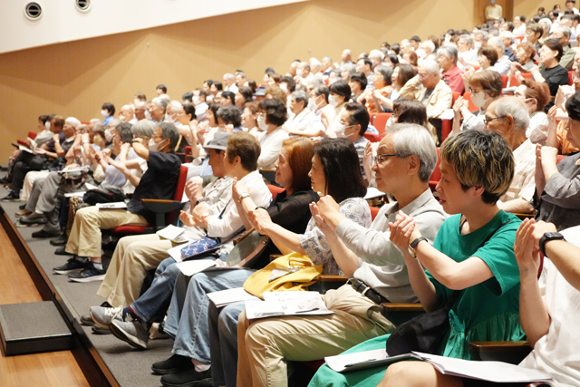鑑賞を前に、能の舞台に登場する能面の解説や、笛や小鼓(こづつみ)、大鼓(おおづつみ)といった囃子(はやし)の特徴が伝えられた。来場者も小鼓のように手と腕を叩いて音を鳴らし、囃子独特のリズムを体験して能楽を楽しんだ。