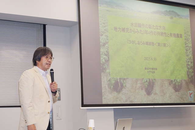 【東近江】 第一線で活躍する農業経営者らを講師に招いた「ひがしおうみ晴耕塾」が先月30日、東近江市役所で開講した。第1回講座では「水田輪作の新たな方向」と題し、龍谷大学の大門弘幸教授が登壇。農業の現状や持続可能な取り組みなどを紹介した。