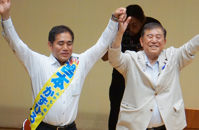 自民新人の宮本和宏氏(53)は10日、石破茂首相を迎え、能登川コミセンで個人演説会を行った。守山市長3期の実績として、人口8千人増や市民病院黒字化、図書館利用3倍増、企業誘致などをアピール。さらに退任後の経済協力開発機構(OECD)の勤務経験から、「今の日本は危機的。賃金はヨーロッパ先進国の半分」と示し、「経験を生かして滋賀を豊かな地域にしたい」と意気込んだ。さらに広域幹線道路などのインフラ整備、魅力のある雇用や観光の促進、世界を視野に入れた教育改革を掲げ「日本を前に進める」と語気を強めた。